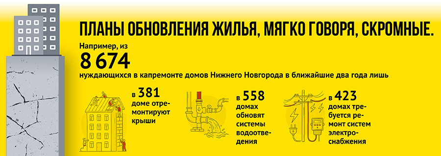Дырявые кровли и плесень на стенах – для нижегородцев многолетняя суровая реальность. Масштаб проблемы поражает: в мае прошлого года Михаил Куренков, занимавший в то время должность и.о. главы областного министерства ЖКХ, на заседании Заксобрания озвучил цифру: в капитальном ремонте нуждаются 16 707 домов нашего региона.