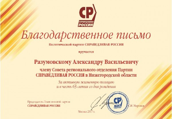 Председатель регионального совета Александр Бочкарев и все члены Нижегородской партийной организации поздравляют Председателя Совета местного отделения партии в Автозаводском районе, Заслуженного врача Российской Федерации, доктора медицинских наук, профессора Разумовского Александра Васильевича с 65-летним Юбилеем! Здоровья, успехов и энергичной деятельности в рядах СПРАВЕДЛИВОЙ РОССИИ! ![]() ![]() ![]() |