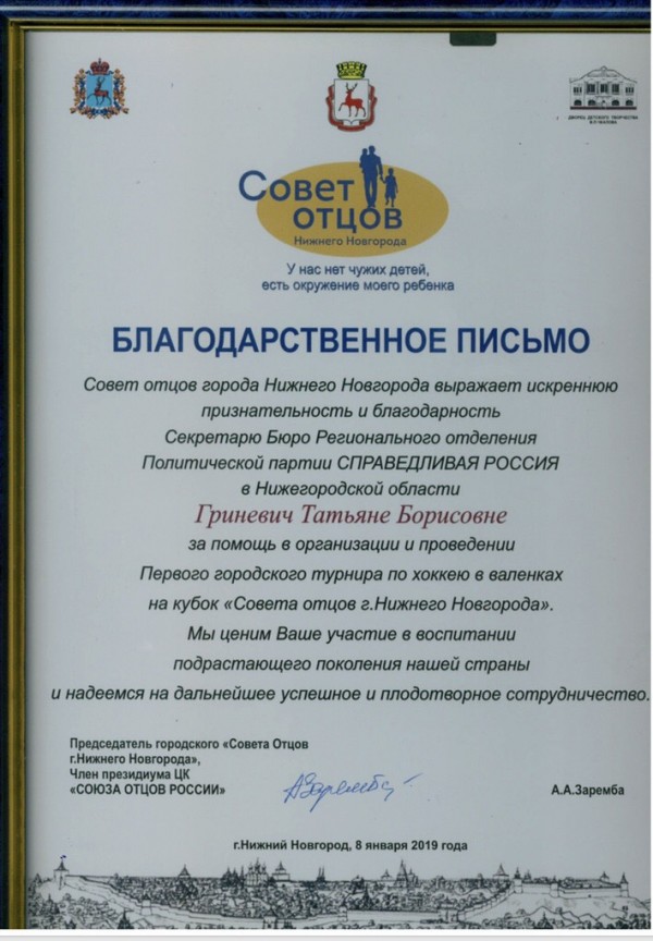 14 января состоялось открытое заседание Совета отцов города Нижнего Новгорода, на которое была приглашена Секретарь Бюро партии СПРАВЕДЛИВАЯ РОССИЯ Татьяна Гриневич Открыла заседание Белик Надежда Николаевна – почетный гражданин Нижегородской области, заслуженный работник культуры, руководитель городской научно-практической лаборатории по проблемам воспитания и семьи с докладом о проблемах воспитания и задачах, которые ставит перед образованием Президент России. Но все же главным вопросом повестки, который обсуждался, был план работы на текущий 2019 год. Отцы работали в секциях по интересу, и каждый вносил свои предложения в культурно-творческом направлении, спортивном, патриотическом воспитании. Председатель городского " Совета отцов г.Нижнего Новгорода" Александр Заремба вручил Татьяне Гриневич благодарственное письмо за помощь в организации и проведении турнира по хоккею в валенках на кубок " Совета отцов г.Нижнего Новгорода". "Роль мужчины – отца в наше время особенно значима. И мне приятно, что в наше время есть мужчины, которые готовы тратить свое свободное время не на прозябание перед телевизором, а готовы вести за собой своих детей и вовлекать их в спорт, театр, воспитывать на своем примере патриотизм к семье, Родине, к родному городу. От имени партии СПРАВЕДЛИВАЯ РОССИЯ благодарю Вас за это и надеюсь на дальнейшее сотрудничество, а турнир по хоккею в валенках на кубок " Совета отцов г. Нижнего Новгорода" при поддержке нашей партии станет традиционным" сказала Татьяна Гриневич ![]() |