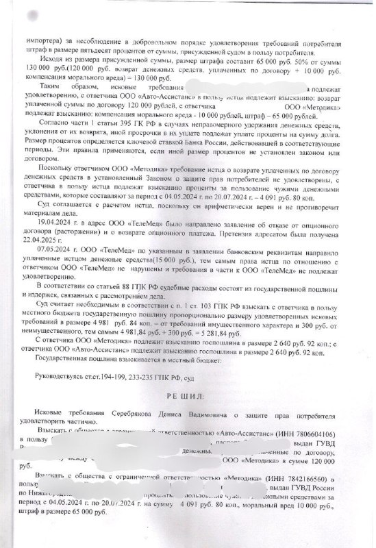 "Юристы Центра ознакомились с документами и отправили претензии в адрес фирм, с которыми были заключены договоры. Ответов не поступило. Тогда юристы составили исковое заявление в суд о взыскании с ответчиков не только стоимости договора, но и процентов, штрафов и морального ущерба. Суд встал на нашу сторону и постановил взыскать 199 000 рублей, из них 4 000 – проценты за пользование чужими деньгами, 10 000 рублей морального вреда и 65 000 рублей – штраф. Если планируете покупку машины, то не забывайте, что автосалон хочет продать вам не только машину, но и разного рода доп. услуги, которыми вы вряд ли сможете воспользоваться. Будьте внимательны к документам, которые подписываете при покупке дорогостоящих товаров. А если вас все таки ввели в заблуждение, вы всегда можете обратиться в наш Центр защиты прав граждан по телефону: 429-16-38, на сайте или ко мне в личные сообщения. " – рассказала Татьяна Гриневич.