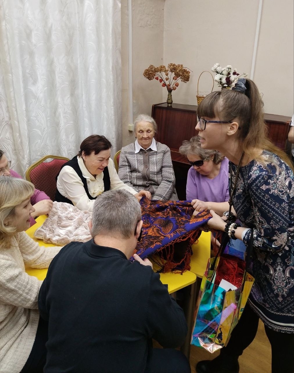 Участники тактильно пытались угадать разные предметы одежды и аксессуары – палантин, шарфы, туфельки, веер – которые появлялись из модной сумки Алёны. После того, как вещь была узнана, Алена погружала присутствующих в историю каждого предмета. Потом прошёл мастер-класс по созданию брошей, где каждый, несмотря на ограничения по зрению, смог попробовать свои силы