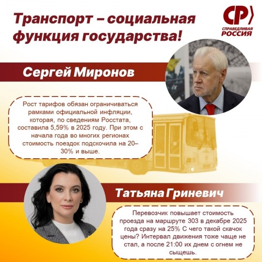 Председатель партии Сергей Миронов убежден, что рост тарифов обязан ограничиваться рамками официальной инфляции, которая, по сведениям Росстата, составила 5,59% в 2025 году. При этом с начала года во многих регионах стоимость поездок подскочила на 20–30% и выше.