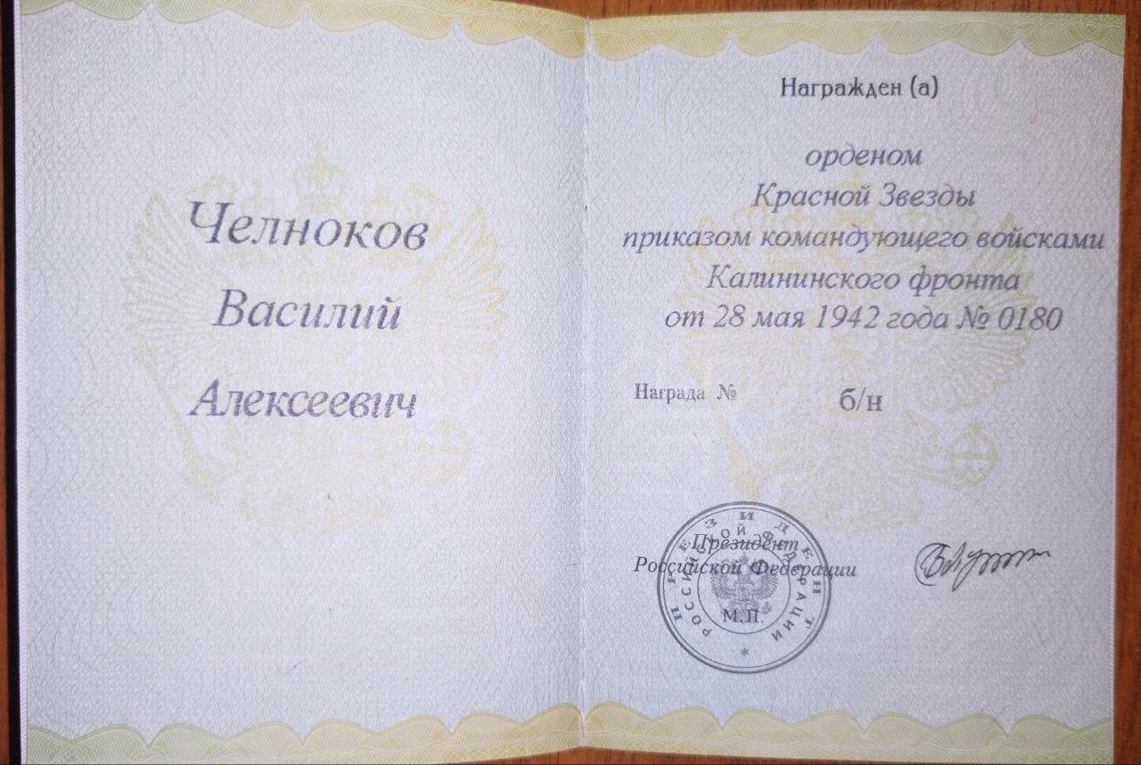 В прошлом году к Алексею Кожухову, депутату городской Думы г. Нижнего Новгорода, обратилась пенсионерка Ольга Васильевна Белова с просьбой помочь ей получить удостоверение к ордену Красной Звезды ее погибшего отца – Челнокова Василия Алексеевича. Приказом командующего войсками Калининского фронта от 28 мая 1942 года №0180 красноармеец Челноков был представлен к награде, но в августе 1942, в ходе ожесточенных боев вблизи деревни Векшино, он погиб и считался пропавшим без вести.